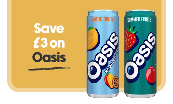 Oasis Save £3 Save £3 on each case of 330ml Oasis Sleek Cans. Credits paid at the end of the promotional period.
