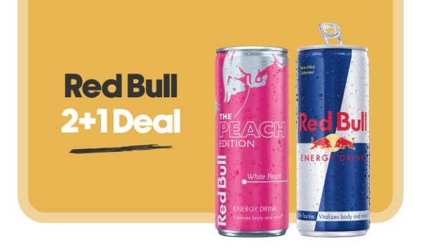 Red Bull 2+1 Deal Buy two cases of Red Bull Energy and get one case of Red Bull White Peach free.