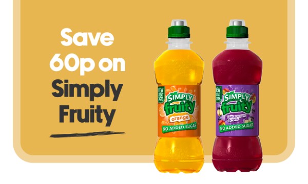 Simply Fruity Save 60p Save 60p on each case of Simply Fruity. Credits paid at the end of the promotional period.