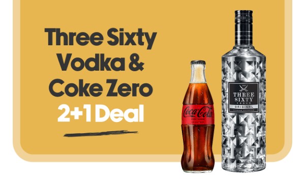 Three Sixty Vodka & Coke Zero 2+1 Deal Buy two x70cl Three Sixty Vodka and get one case of Coca-Cola Zero Sugar free.