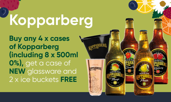 Buy any 4 x cases of Kopparberg (including 8 x 500ml 0%), get a case of NEW glassware and 2 x ice buckets FREE