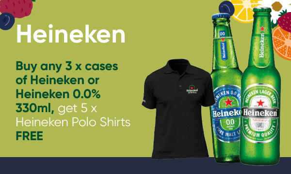 Buy any 3 x cases of Heineken or Heineken 0.0% 330ml, get 5 x Heineken Polo Shirts FREE