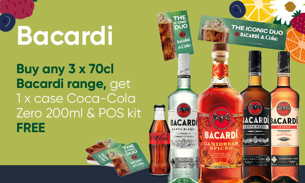 Buy any 3 x 70cl Bacardi range, get 1 x case Coca-Cola Zero 200ml & POS kit FREE