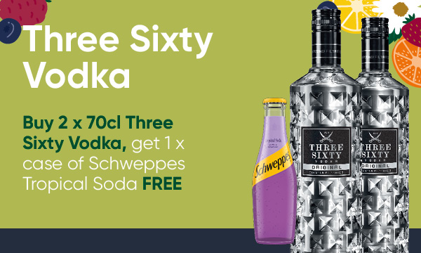 Buy 2 x 70cl Three Sixty Vodka, get 1 x case of Schweppes Tropical Soda FREE