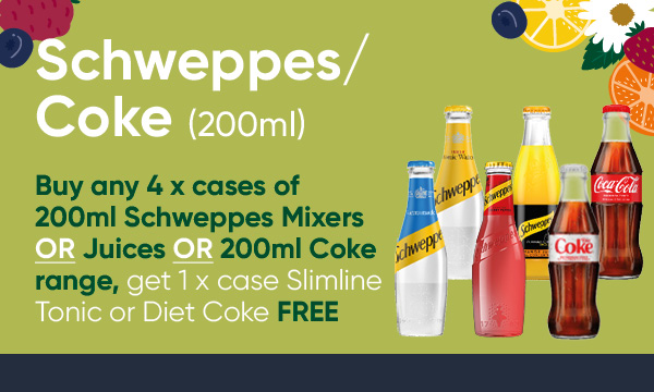 Buy any 4 x cases of 200ml Schweppes Mixers or Juices or 200ml Coke range, get 1 x case Slimline Tonic or Diet Coke FREE