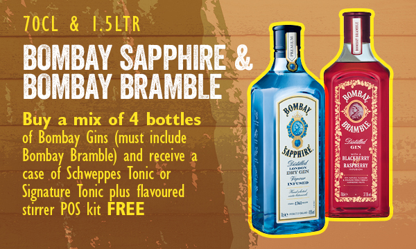 Buy a mix of 4 bottles of Bombay Gins (must include Bombay Bramble) and receive a case of Schweppes Tonic or Signature Tonic plus flavoured stirrer POS kit free