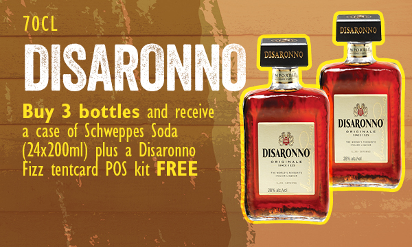Buy 3 bottles and receive a case of Schweppes Soda (24x200ml) plus a Disaronno Fizz tentcard POS kit free