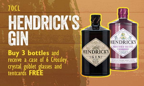 Hendricks Gin Buy 3 bottles and receive a case of 6 Crossley crystal goblet glasses and tentcards free 6 x Crossley Crystal goblet glasses, 20 x tent cards