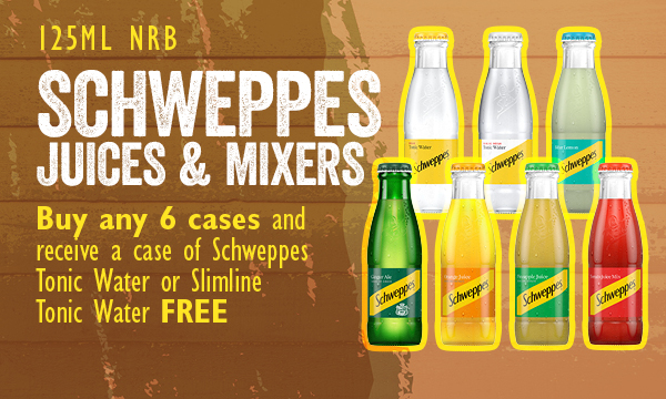 Buy any 6 cases and receive a Schsweppes Tonic Water or Slimine Tonic Water free