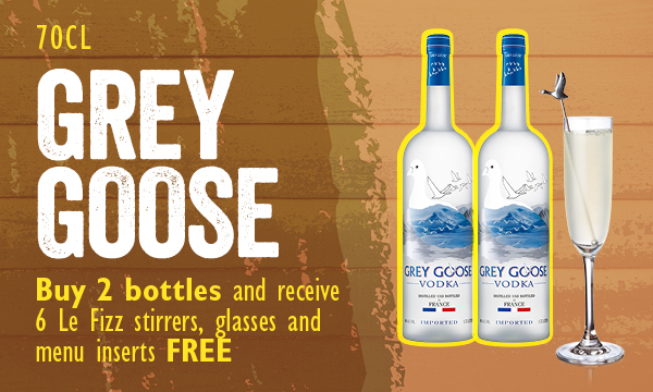 Grey Goose 70cl Buy 2 bottles and receive 6 Le Fizz stirrers, glasses and menu inserts free 6 Le Fizz Stirrers, glasses, menu inserts