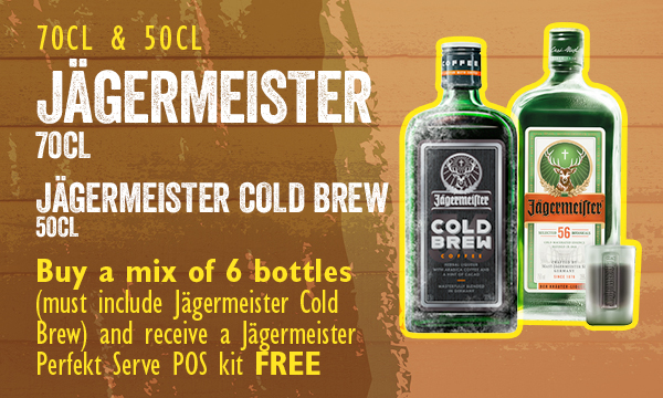Jagermeister Buy a mix of 6 bottles (must in Jagermeister Cold Brew) and receive a Jagermeister Perfect Serve POS kit free 2 x Bar Runners, 2 x Chalkboards, 2 x Chalkboard stickers, 4 x lanyards, 4 x t-shirts