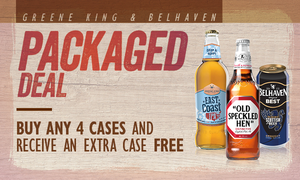 Greene King & Belhaven Packaged Deal Buy any 4 cases and receive an extra case free Qualifying products 8x500ml nrb - Old Crafty Hen, Old Golden Hen, Old Hoppy Hen, Abbot Reserve, Belhaven 80/-, Belhaven Robert Burns Ale, Belhaven St Andrews Ale, East Coast IPA, GK IPA, Old Bob, Ruddles County, 24x440ml can Belhaven Best, 12x500ml nrb Old Speckled Hen, Abbot Ale, 12x355ml Old Speckled Hen, 8x500ml Belhaven Black, 24x440ml Belhaven Black can, 8x500ml Old Speckled Hen Low Alc, GK IPA Gluten Free, Old Speckled Hen Gluten free |