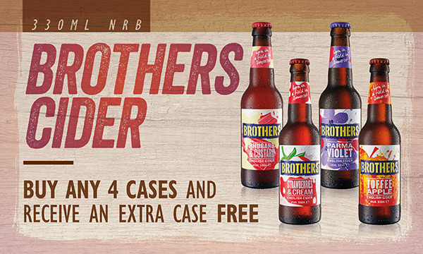 Brothers Cider 24x330ml nrb Buy any 4 cases and receive an extra case free Qualifying products 24x330ml Brothers Parma Violet, Rhubard & Custard, Strawberries & Cream, Toffee Apple |