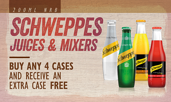 Schweppes Juices & Mixers 200ml Buy any 4 cases and receive an extra case free Qualifying products 24x200 Schweppes Lemonade, Tonic, Slimline Tonic, Ginger Beer, Soda, Bitter Lemon, Canada Dry Ginger Ale, Orange, Pineapple, Tomato |