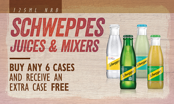 Schweppes Juices & Mixers 125ml Buy any 6 cases and receive an extra case free Qualifying products 24x125ml Schweppes Orange, Pineapple, Tomato, Tnic Water, Slimline Tonic, Bitter Lemon, Canada Dry Ginger Ale |
