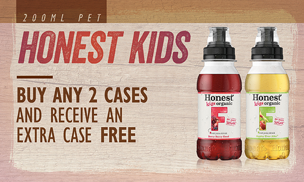 Honest Kids 24x200ml Buy any 2 cases and receive an extra case free Qualifying products 24x200 Honest Kids Appley Ever After, Berry Berry Good |