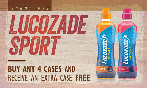 Lucozade Sport 500ml PET Buy any 4 cases and receive an extra case free Qualifying products 12x500 Lucozade Sport Orange, Raspberry |