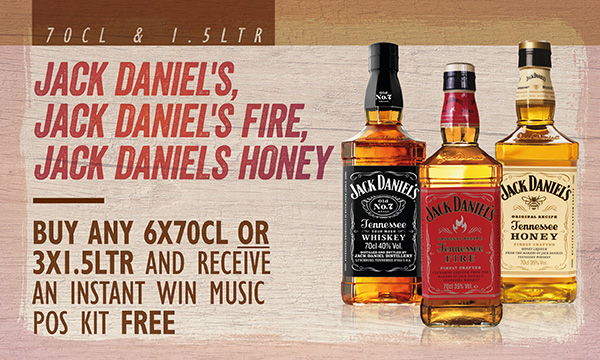 Jack Daniels Buy any 6x70cl or 3x1.5ltr and receive an instant win Music POS Kit free 20 x tent cards, 6 x t-shirts, 200 x music prize win mechanic garnishes Qualifying products 70cl Jack Daniels Fire, Tennessee Whiskey, Honey |