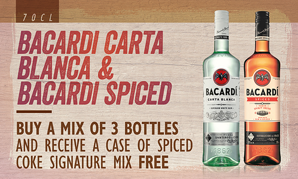 Bacardi Carta Blanca & Bacardi Spiced Buy a mix of 3 bottles and receive a case of Spiced Coke Signature Mix free Qualifying products 70cl Bacardi Carta Blanca, Bacardi Spiced |