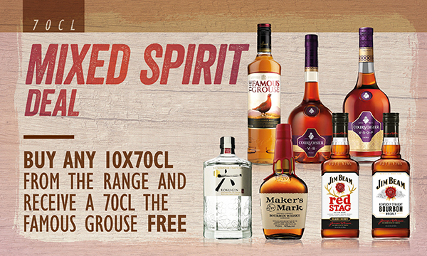 Mixed Spirit Deal Buy any 10 x 70cl from the range and receive a 70cl The Famous Grouse free Qualifying products 70cl The Famous Grouse, Roku Gin, Courvoisier VS, Courvoisier VSOP, Highland Park, Auchentoshan American Oak, Laphroaig 10 yr old, Bowmore 12 Yr old |