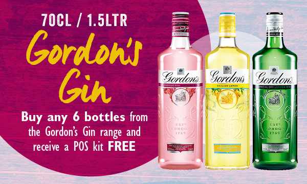 Buy any 6 bottles from the Gordon's Gin range and receive a free POS kit containing Gordon's Pink & Lemon bunting and tent cards