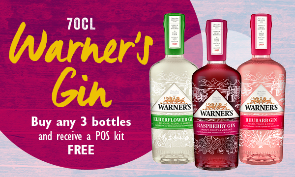 Warner's Gin Buy any 3 bottles and receive a free POS kit containing 6 glasses, 1 chalkboard and back bar display unit Warner's Chalkboard & Glasses POS Kit FT