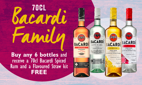 Buy any 6x70cl and receive a 70cl Bacardi Spiced plus a flavoured straw POS kit free