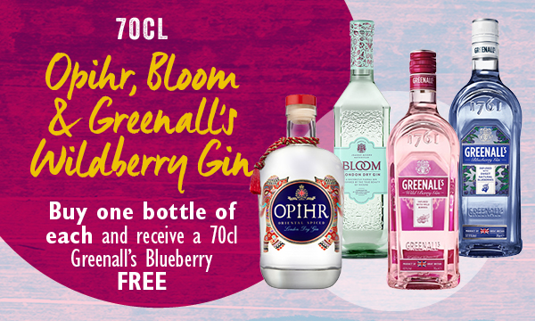 Ophir, Bloom & Greenall's Wildberry Gin Buy one bottle of each and receive a 70cl Greenalls Blueberry free