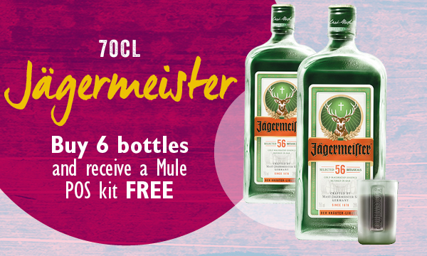 Jagermeister Buy any 6 bottles and receive a free Mule POS kit containing Mule Plinth, Bar runners, chalkboards and stickers, t-shirts and digital screen content Jagermeister Mule POS Kit (FT) 1 kit per customer per promotional period |