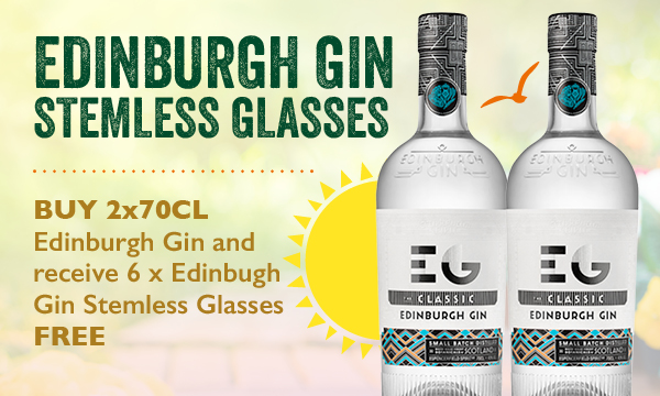 Edinburgh Gin Stemless Glasses Buy 2 x 70cl Edinburgh Gin receive 6 x Edinbugh Gin Stemless Glasses 6 x Edinburgh Gin Branded Stemless Glasses
