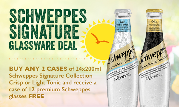 Buy any 2 cases of 24x200ml Schweppes Signature Collection Crisp or Light Tonic and receive a case of 12 premium Schweppes glasses free