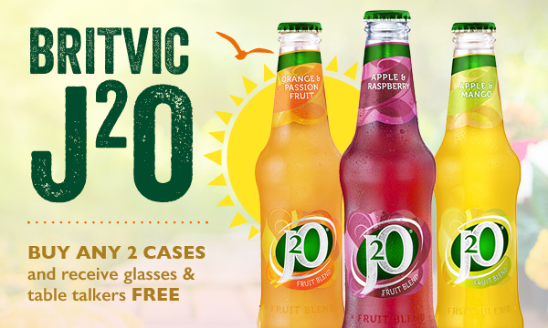 Britvic J2O Buy any 2 cases and receive glasses & table talkers free 24 x Individually boxed new J2O glasses to run a guest promotion in your pub, 12 x J2O table talkers, 12 x new J2O glasses