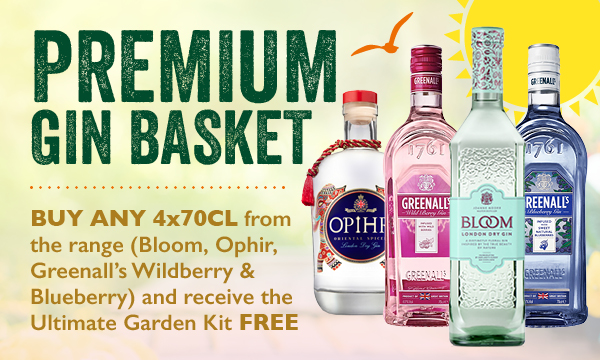 Premium Gin Basket (Greenall's, Bloom, Opihr) Buy any 4x70cl from the range (Bloom, Ophir, Greenalls Wildberry & Blueberry) receive the ultimate garden kit free Garden Umberella, 2 x Blankets, Glassware for all products, Bar mats, Polo Shirt & Extra Garden item (speaker of Giant Game)