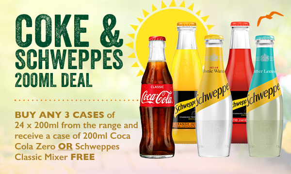 Coke & Schweppes 200ml Deal Buy any 3 cases of 24 x 200ml from the range receive a case of 200ml Coca Cola Zero OR Schweppes Classic Mixer free