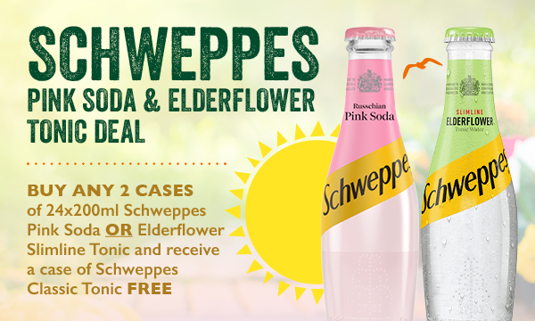 Buy any 2 cases of 24x200ml Schweppes Pink Soda or Elderflower Slimline Tonic receive a case of Schweppes Classic Tonic free