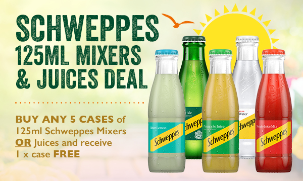 Schweppes 125ml Mixers & Juices Deal Buy any 5 cases of 125ml Schweppes Mixers or Juices and receive 1 x case free