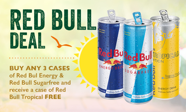Buy 3 any 3 cases of Red Bul Energy & Red Bull Sugar Free and receive a case of Red Bull Tropical Free