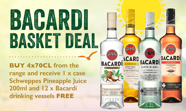 Bacardi Basket Deal Buy 4 x 70cl from the range receive 1 x case Schweppes Pineapple Juice (TBC) Free and 12x Bacardi drinking vessels glasses free Bacardi Drinking Glasses