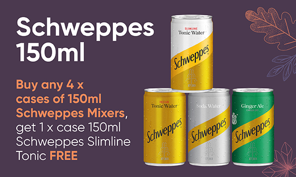 Buy any 4 x cases of 150ml Schweppes Mixers, get 1 x case 150ml Schweppes Slimline Tonic FREE