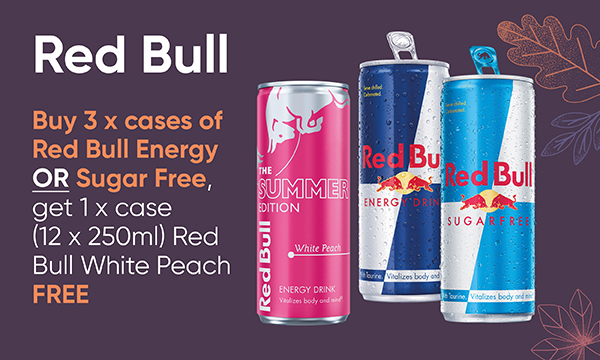 Red Bull Buy 3 x cases of Red Bull Energy or Sugar Free, get 1 x case (12 x 250ml) Red Bull White Peach FREE