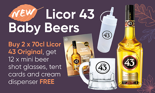 Buy 2 x 70cl Licor 43 Original, get 12 x mini beer shot glasses, tent cards and cream dispenser FREE