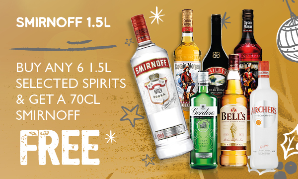 FREE 70cl bottle of Smirnoff Red, when you buy any 12 x 70cl Smirnoff Red, Smirnoff Peppermint, Gordon's (Special Dry, Pink or Sloe), Bell's, Archers, Captain Morgan Dark, Captain Morgan Spiced, Baileys Irish Cream, Baileys Strawberries & Cream. 300 deals available from 25th November 2019.