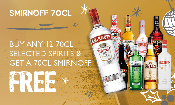 Buy any 12 x 70cl Smirnoff Red, Smirnoff Peppermint, Gordon's, Bell's, Archers, Captain Morgan Dark, Captain Morgan Spiced, Baileys Irish Cream, Baileys Strawberries & Cream, get a 70cl Smirnoff Red FREE