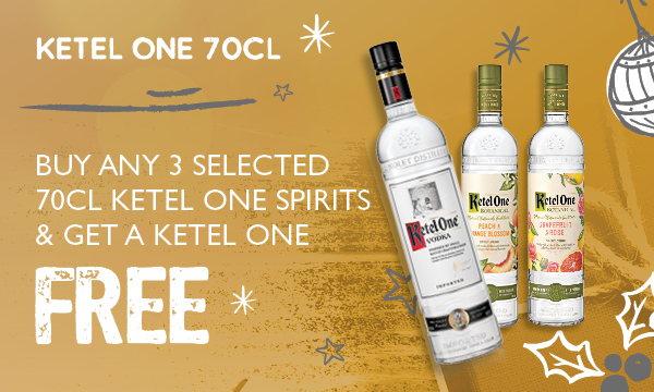FREE 70cl bottle of Ketel One, when you buy any 3 x 70cl Ketel One, Ketel One Peach & Orange or Ketel One Grapefruit & Rose. 300 deals available from 25th November 2019.