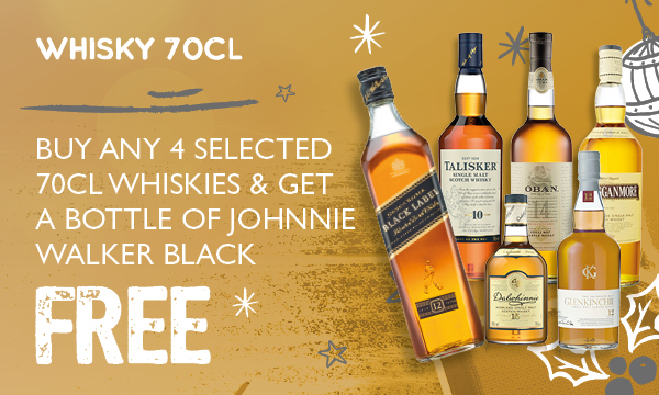 Malt Whisky Deal Buy any 4 x 70cl Talisker, Oban, Lagavulin, Cragganmore, Glenkinchie or Dalwhinnie, get a bottle of Johnnie Walker Black FREE FREE 70cl bottle of Johnnie Walker Black , when you buy any 4 x 70cl Talisker, Oban, Lagavulin, Cragganmore, Glenkinchie or Dalwhinnie. 300 deals available from 25th November 2019. |