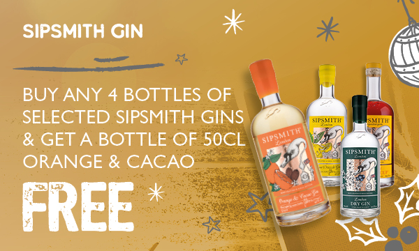 Sipsmith Gin Range Deal Buy any 4 x bottles of Sipsmith London Dry, Orange & Cacao, Lemon Drizzle, Sloe Gin or London Cup, get 1 x bottle of 50cl Orange & Cacao FREE FREE 50cl bottle of Sipsmith Orange & Cacao, when you buy any 4 x bottles of Sipsmith London Dry, Orange & Cacao, Lemon Drizzle, Sloe Gin or London Cup. 500 deals available from 25th November 2019. |
