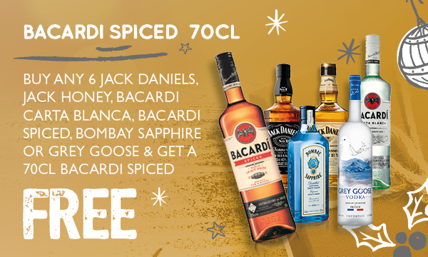 Buy any 6 x 70cl Jack Daniels, Jack Honey, Bacardi Carta Blanca, Bacardi Spiced, Bombay Sapphire or Grey Goose, get 1 x 70cl Bacardi Spiced FREE