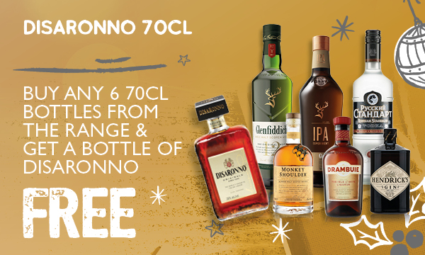FREE 70cl bottle of Disaronno, when you buy any 6 x 70cl bottles from the William Grant & Sons range (Disaronno, Tia Maria, Drambuie, Glenfiddich 12yo, Glenfiddich IPA, Balvenie Double Wood 12yo, Tullamore Dew, Hendrick's Gin, Hendrick's Midsummer Solstice, Verano Watermelon Gin, Monkey Shoulder, Reyka Icelandic vodka, Russian Standard, Zubrowka Bison Grass vodka, Morton's OVD rum, Woods Navy rum). 500 deals available from 25th November 2019.
