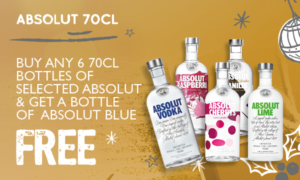 FREE 70cl bottle of Absolut Blue, when you buy any 6 x 70cl bottles of Absolut Blue, Raspberri, Vanilla, Mandarin, Cherry or Lime. 150 deals available from 25th November 2019.