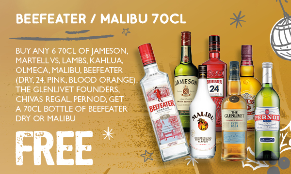 FREE 70cl bottle of Beefeater Dry or Malibu, when you buy any 6 x 70cl of Jameson, Martell VS, Lambs, Kahlua, Olmeca, Malibu, Beefeater Dry, Beefeater Pink, Beefeater Blood Orange, Beefeater 24, The Glenlivet Founders, Chivas Regal, Pernod. 250 deals available from 25th November 2019.
